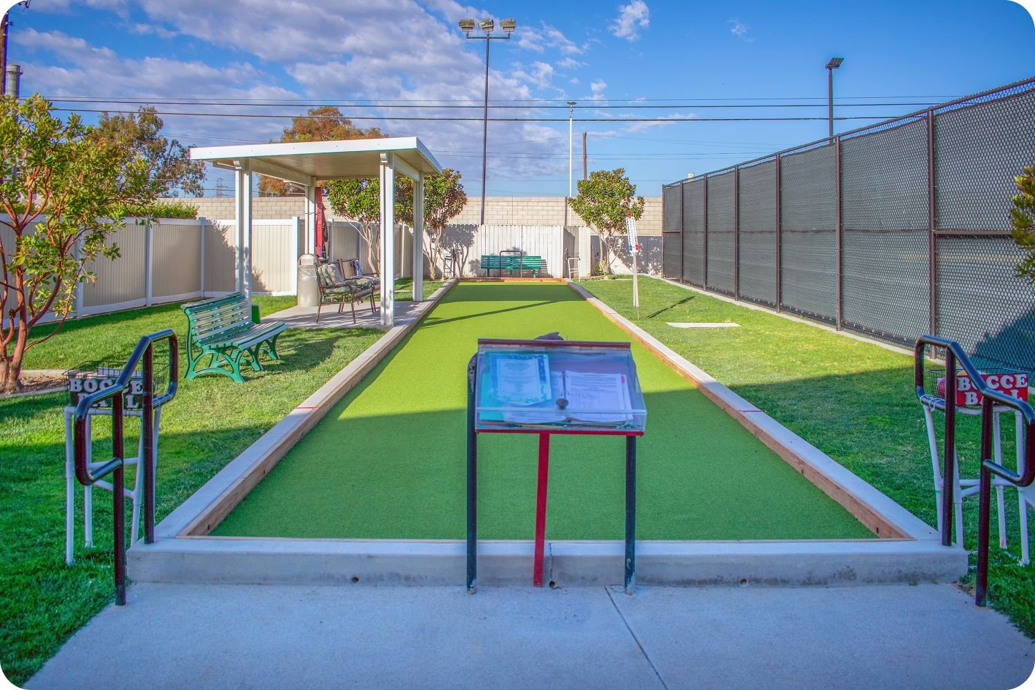 The Bocce Court is located at Clubhouse 2 in Mission Park, adjacent to the multipurpose courts. It is open 7 days a week from 8:00am to 8:00pm For more information contact the Bocce Ball Club, in the Sports section under Clubs and Organizations.