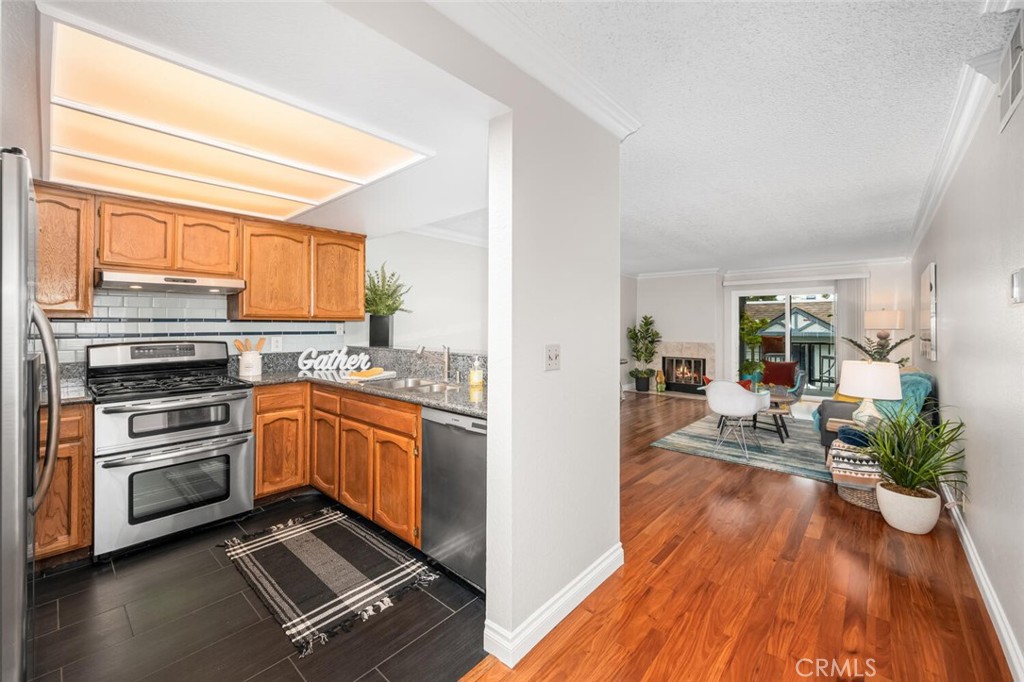 Welcome to this charming and pristine 1 bedroom 1 bathroom home in the heart of Signal Hill. As you enter you are greeted by glowing hardwood floors and immediate entryway closet perfect for additional storage or added pantry. Next you find the kitchen with plenty of Oak cabinets and granite counter tops with all stainless steel appliances including dishwasher, double door refrigerator and double oven. The counter steps up which creates an additional counter space for breakfast bar. The living room is expansive and provides an additional space for dining as well as space for large furniture while enjoying the gas fireplace. The room is illuminated by the double pane sliding glass door which leads you to a covered patio. Down the hall you find a closet with stackable washer/dryer. The ba...
