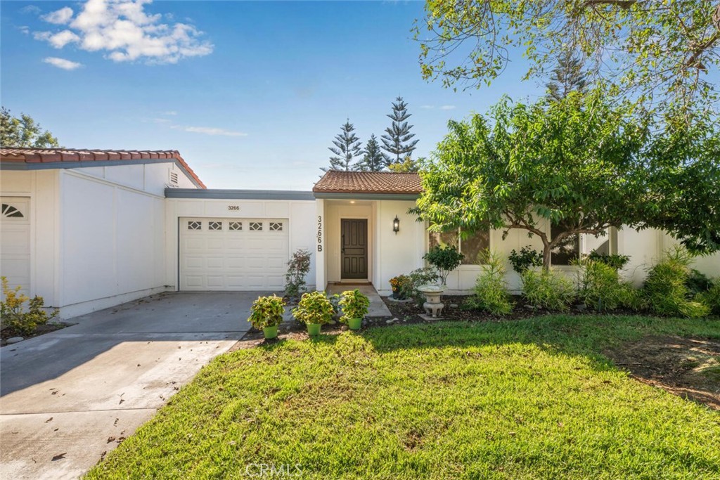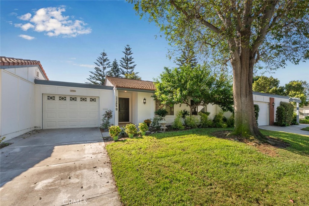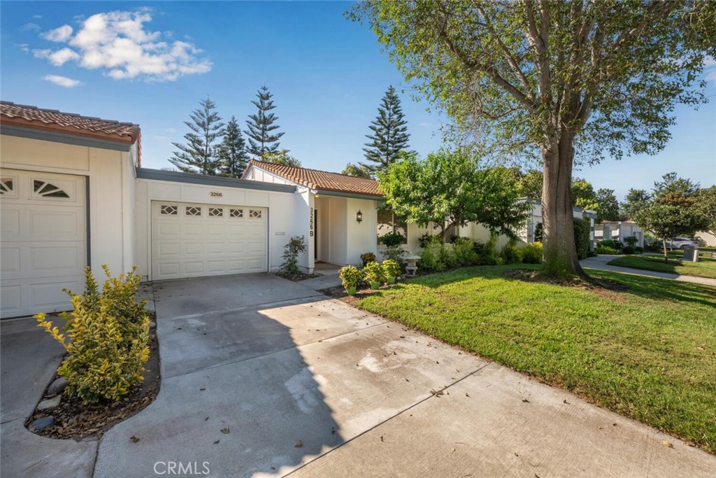 Welcome to this renewed and reimagined Las Flores model home in Third Mutual of Laguna Woods! Few homes here greet you with a deep 1 car garage, driveway and front yard. Inside you find a striking beamed open ceiling over the living room with custom chevron pattern electric fireplace as a focal point. From there you can't help but notice the large dual pane windows which bring the lush exterior inside your view. A slider off the dining room brings you to your own private sanctuary with tiled patio and grassy backyard lined with mature trees with a view of the surrounding hills. You feel like you have no neighbors! The kitchen has been tastefully styled with all new stainless steel appliances, quartz counters, Shaker Cabinets, breakfast bar, floating hood vent and recessed lighting. Down the hall you have a linen closet and full guest bathroom with new vanity and tiled tub glass partition. The primary suite is a very large bedroom with a dual vanity bathroom complete with quartz counters, tiled floor and low threshold tiled shower glass enclosure. Don't forget this home has a high quality laminate floor throughout with central AC, new water heater, and washer/dryer hookups. This home is ideally situated within Laguna Woods, allowing residents to take full advantage of its amenities. Laguna Woods Village residents are privileged to enjoy a 27-hole championship golf course, a 9-hole executive par 3 course, pickleball and tennis courts, lawn bowling, gyms, clubhouses, swimming pools, horse stables, gardening centers, an art studio, a world-class wood shop, computer workrooms and classes + over 200 clubs and organizations!