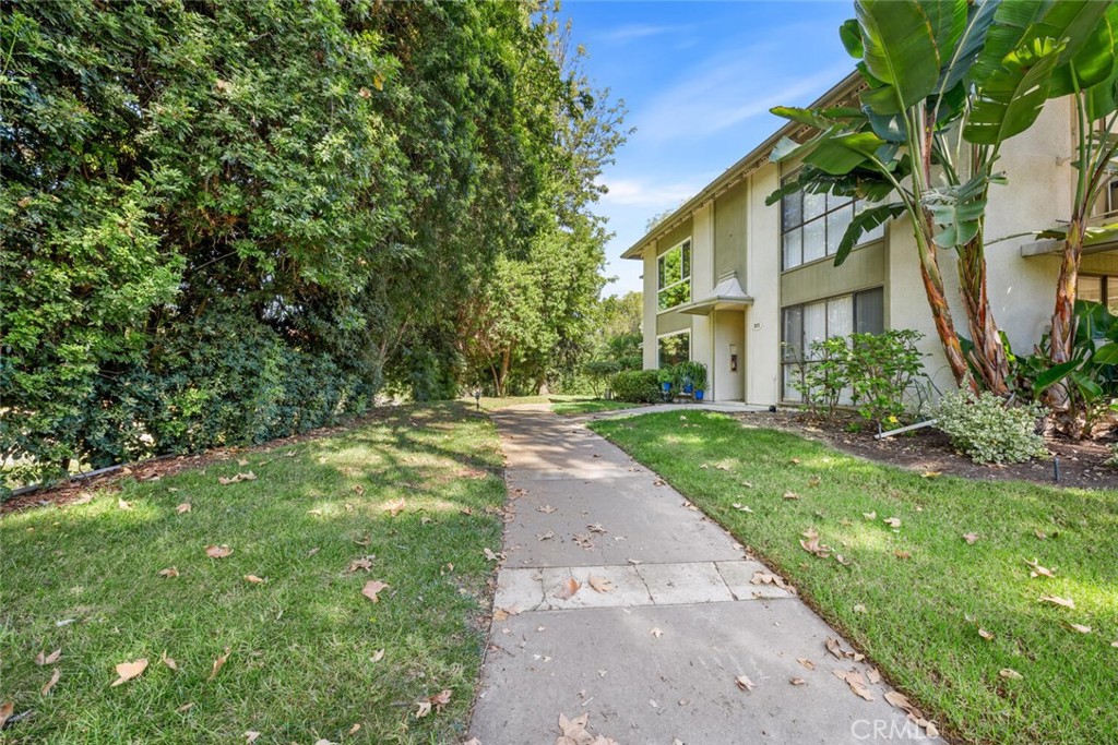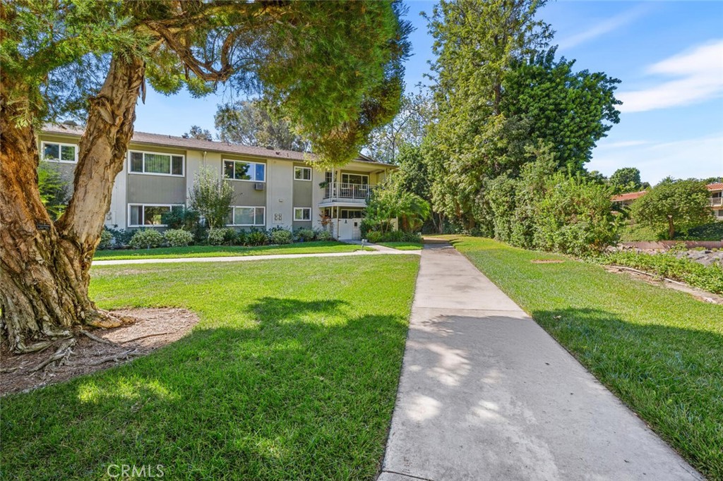 This "Cadiz Model" 1 bedroom home is a true treehouse. The moment you enter the front door you are greeted by immense light from the double pane windows. With the windows open, the trickle sound of the creek just outside and cross breeze come through this corner unit creating a tranquil atmosphere. It is a complete "vibe" at this home unlike anything else you have seen in the community. Newer laminate floors meets designer carpeted living room where there is room for large furniture, an office if need be, and AC heat pump. A patio door leads you outside with the best place to have coffee or tea in the morning absorbing the sound of nature all around you. The kitchen is complete with refrigerator, dishwasher, glass cooktop and oven. The kitchen is attached to the dining area which is great for hosting company. The bedroom is it's own suite with ceiling fan, wall AC unit and washer/dryer in closet. The bathroom hosts many cabinets great for storage with a well maintained shower/tub and vanity. Don't forget this home has new attic insulation which makes for great energy efficiency and comfort on hot and cold days. Parking: Garage 673, Space 7. This remarkable home is ideally situated within Laguna Woods, allowing residents to take full advantage of its impressive amenities. Laguna Woods Village residents are privileged to enjoy a 27-hole championship golf course, a 9-hole executive par 3 course, pickleball and tennis courts, lawn bowling, gyms, clubhouses, swimming pools, horse stables, gardening centers, an art studio, a world-class wood shop, computer workrooms and classes + over 200 clubs and organizations!